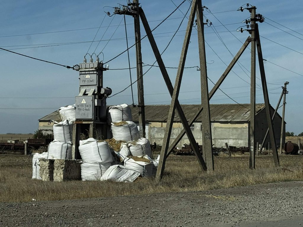 Мішками з піском захищають транформаторні підстанції від ударів ворога. Село Високе Тягинської громади. Фото – Оксана Піднебесна