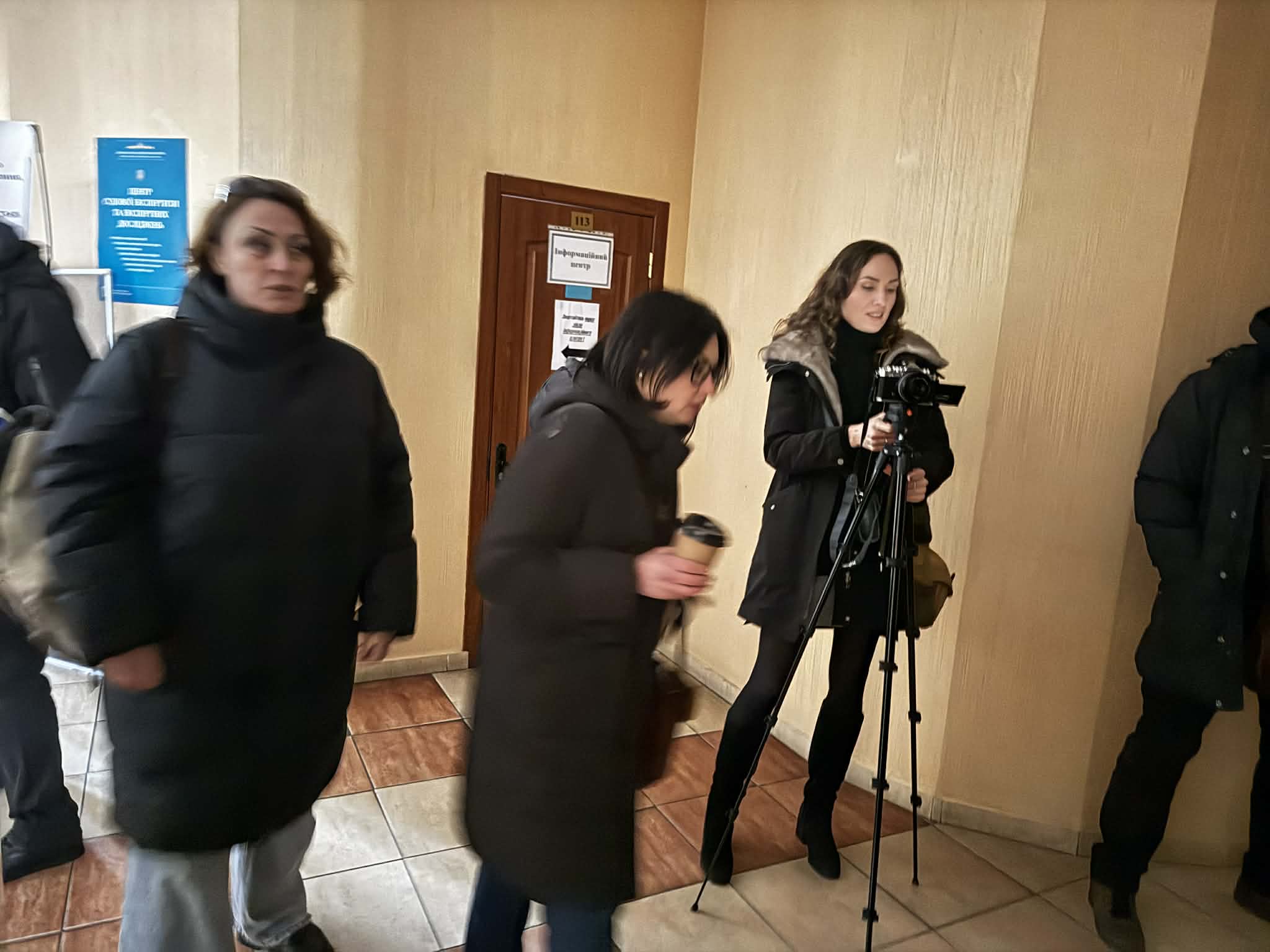 Адвокатки фігурантів кримінальної справи (зліва направо) Євгенія Тарасенко, Ольга Панченко; операторка “Суспільного прибою” в коридорі Приморського суду м. Одеси