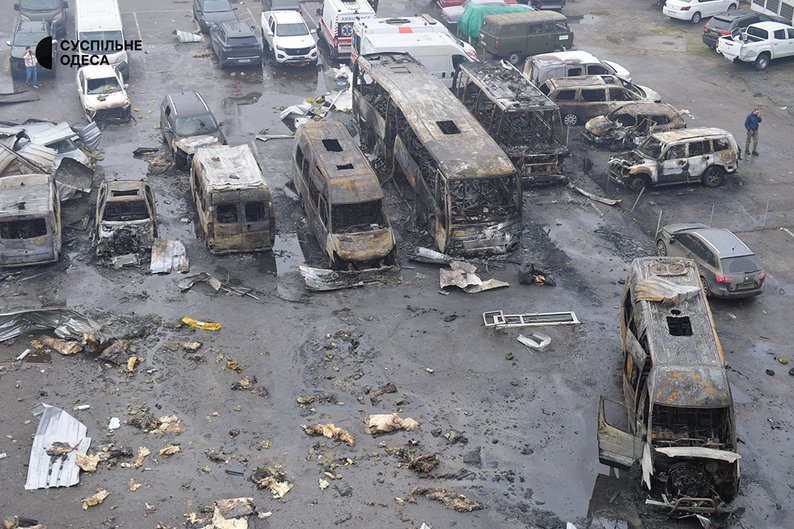 На місці влучань спалахнули пожежі, зокрема в автосалоні. Вогонь охопив близько двох тисяч квадратних метрів, пошкоджено майже 30 автомобілів.