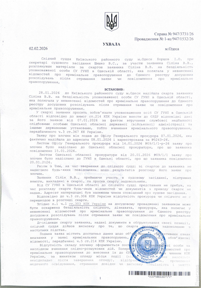 Після того як протягом місяця поліція не внесла відомості до ЄРДР, Сілін звернувся до Київського районного суду Одеси.