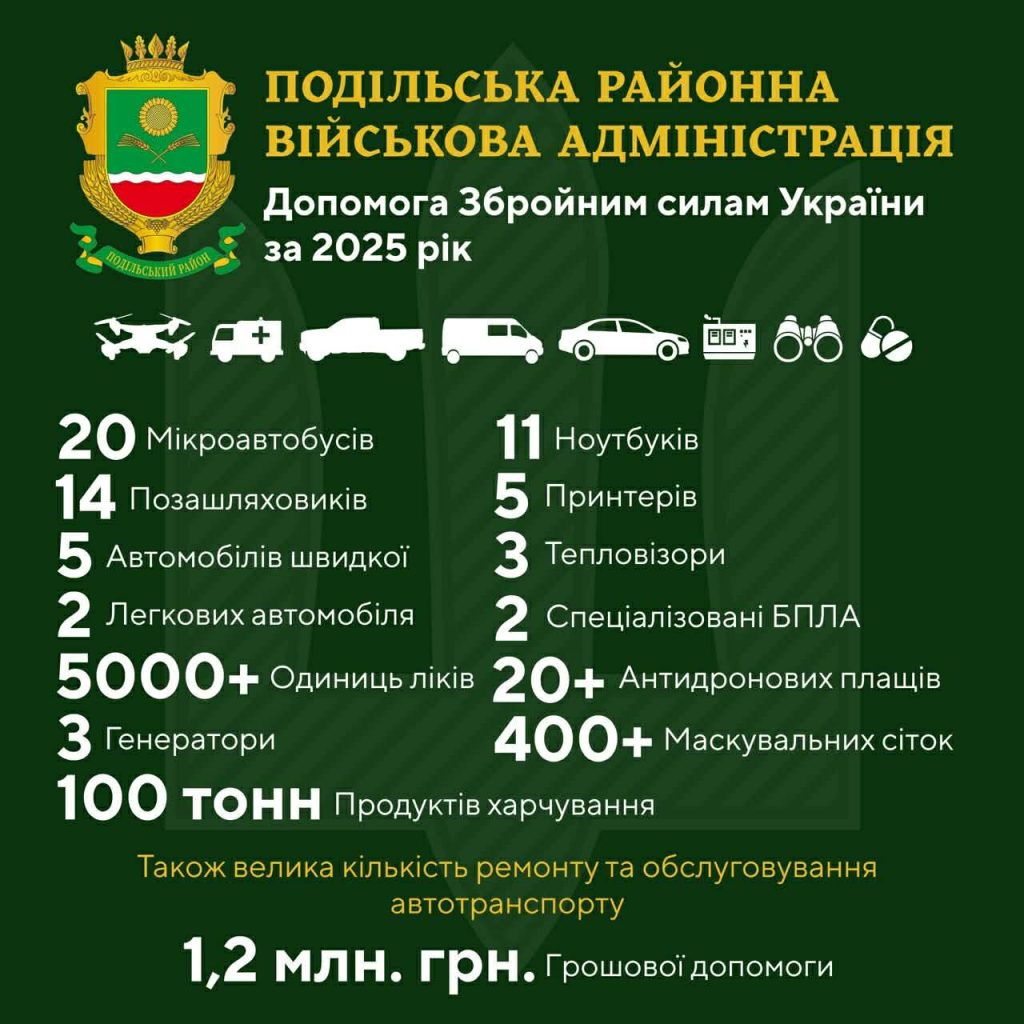 Серед них лише у 2025 році – 20 мікроавтобусів, 14 позашляховиків для фронту, а також генератори, маскувальні сітки, БПЛА.