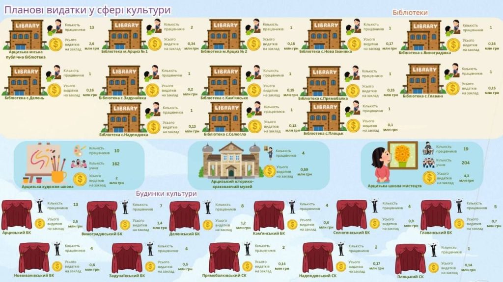 На належне утримання закладів – понад 2,5 млн грн. У селах громади збережена і працює велика мережа закладів: бібліотеки, будинки культури, музей. Це той фундамент, який формує культурний простір у кожному населеному пункті, розповів пан Парпуланський.