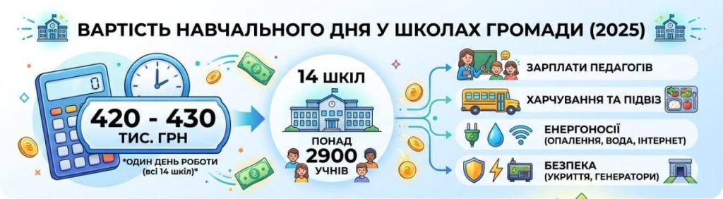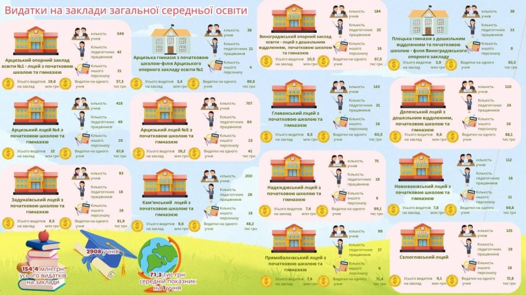 У школах Арцизької громади здобувають освіту понад 2900 учнів. У середньому на одного учня припадає на рік 71,3 тис грн бюджетних видатків. А один день роботи шкіл обходиться в 430 тисяч грн.