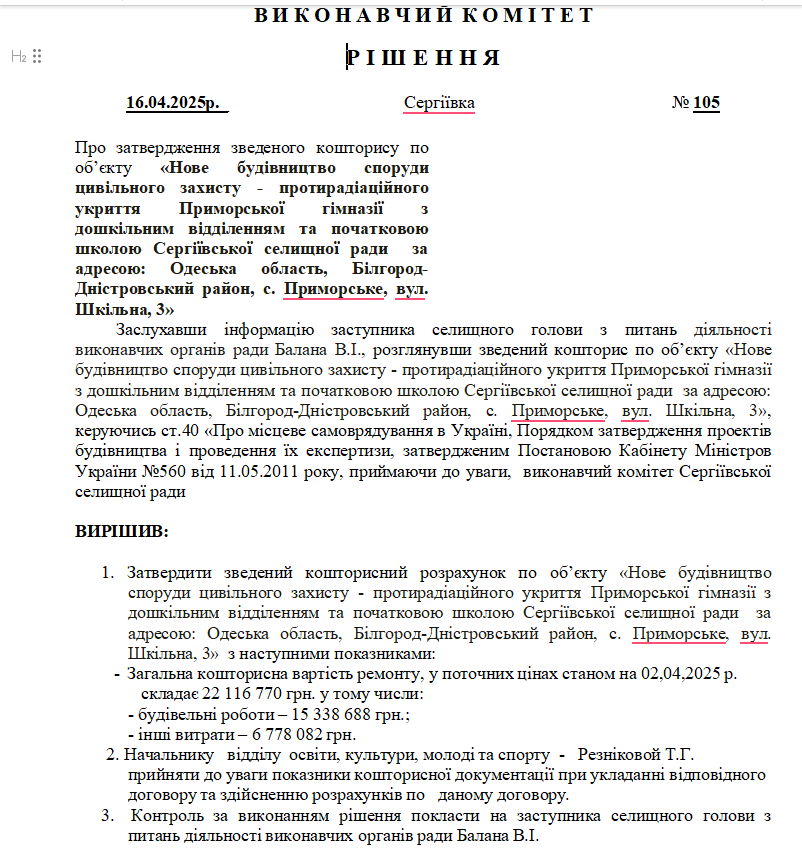 Рішення виконкому Сергіївської ради про кошторис на укриття в с. Приморське